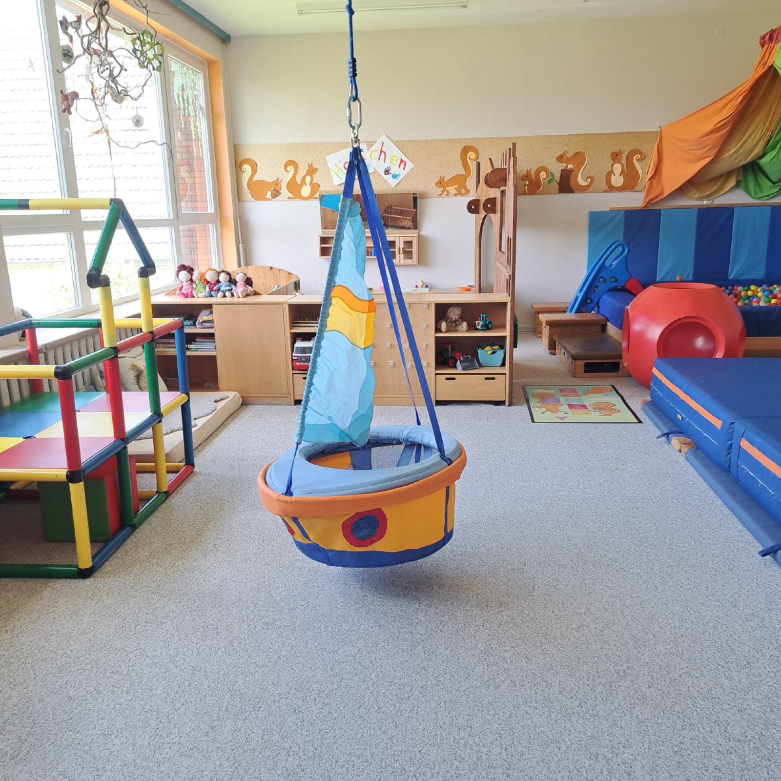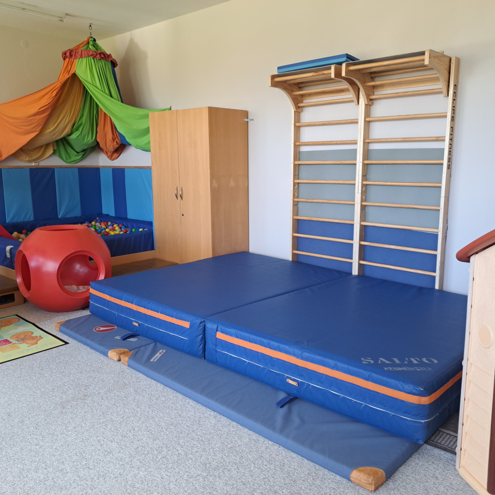 Wenn die Regenkleidung nicht mehr ausreicht, können wir jederzeit in den Gemeindesaal,der von uns als Turnhalle genutzt wird ausweichen.